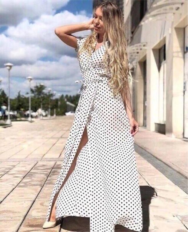 Ніжне літнє жіноче плаття довжини міді в горох на запах (Норма)